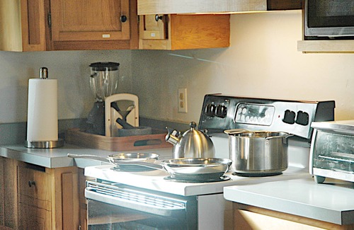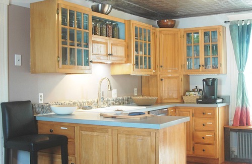 - Eat in kitchen with restored tin ceilings, round table, countertop peninsula, craftsman cabinets, classic electric range, toaster oven, Keurig coffee, cocoa, selection of teas.