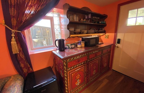 Inside the apartment, you will find a colorful and unique space to relax in. This includes a kitchenette set up with a coffee maker, electric kettle, mini fridge, microwave, toaster, cutting boards, dishes, glasses, and utensils like flatware, wine & can opener, cheese grater etc. It does not have a stove or hot plate. The first 5 guests will receive an additional and delicious amenity.