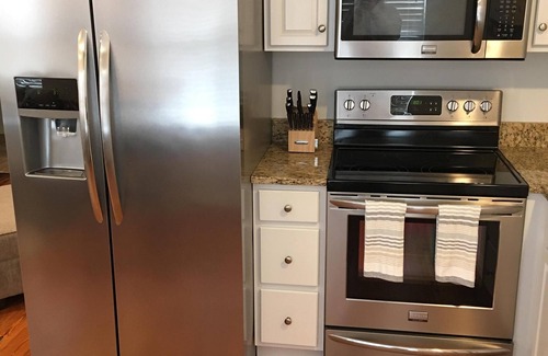 The cabin has a fully stocked kitchen including a Keurig coffee maker and living area with a flat screen TV. There is a queen size bed and flat screen TV in each bedroom. A charcoal grill and a table and chairs are located underneath the cabin for enjoying the outdoors. Also, there is a community pool located across the driveway from the cabin.