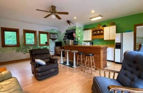 Inside the cozy 500 sq ft cottage, you'll find a comfortable living area equipped with a 32-inch flat-screen HDTV. The Queen Murphy pull-down bed offers flexibility, allowing you to maximize floor space during the day and enjoy a restful night's sleep. Additional sleeping space is provided by the Queen pull-out sofa, perfect for accommodating kids or a second couple.