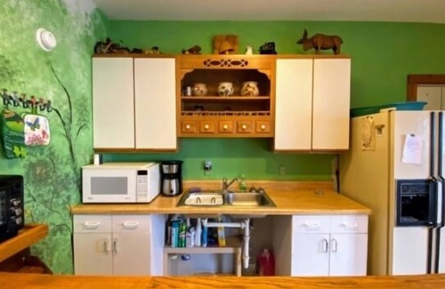 While the kitchen may be small, it is fully equipped with essentials including a hotplate, fridge, microwave, sink, and coffee pots-both standard and Keurig. With no stove/oven or dishwasher, you'll be inspired to cook most of your meals on the grill and savor the outdoor dining experience.