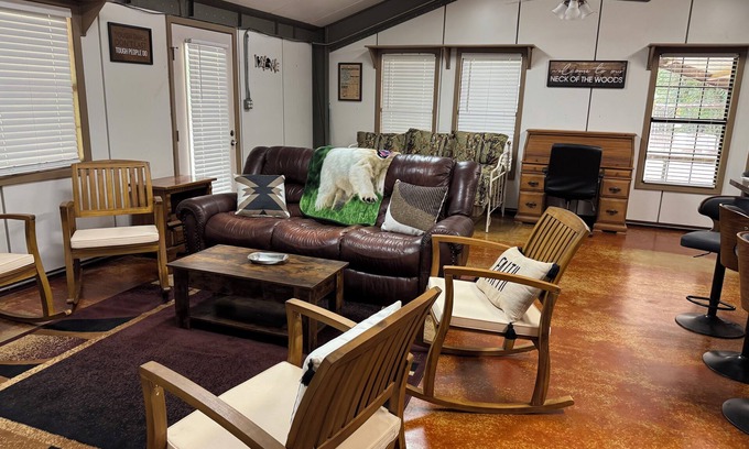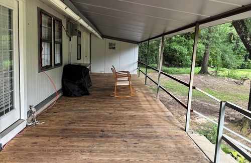 Large camp house within walking distance to Bayou D'Arbonne and a short drive to boat launch on the Ouachita River. Come fish or hunt North Louisiana. Also a few short miles up the road to Bayou D'Arbonne National Wildlife Refuge, Plenty of parking for several cars, a boat and ATV's. Gate between house and rest of property. Large wrap around deck with outdoor griddle and grill. Sit on the porch in a rocker and relax. Large kitchen with new refrigerator, Keurig duo coffee maker, island bar with stools also dining table. Living room with leather couch, daybed, rocking chairs and smart TV. Single large bedroom with king size bed with charging ports and alarm clock, smart TV, large dresser and vanity with drawers and mirror. Plenty of storage for clothes or supplies. New washer and dryer in large laundry room. Extra space in laundry room to put another daybed or bunkbeds. There is a pond in view of the porch but is not part of the property. Enjoy watching the turtles sun themselves but no fishing. Dogs welcome but need to be walked on a leash as the entire property is not fenced. Nearby shopping and things to do in Monroe/West Monroe area. Also open to long term rental for companies with staff working in this area.