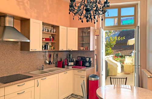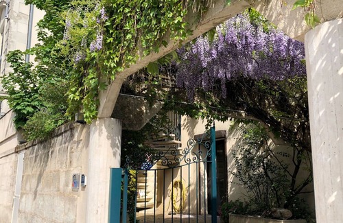 A quiet haven on the edge of the pedestrian area. Haussmann apartment with lift. Lovely high molded ceilings, wooden floors, high-end fixtures. Your private entrance with interior parking and electric gate accesses the large charming terrace without vis-à-vis. The kitchen is worthy of blue ribbons and two bathrooms provide the perfect comfort. King size bed 180x200 great comfort. Conditioning.