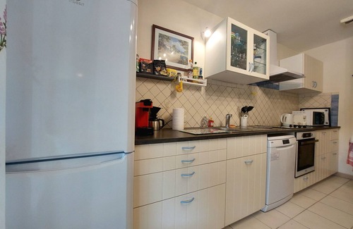 * a fully equipped American kitchen: dishwasher, microwave and traditional ovens, large fridge / freezer
