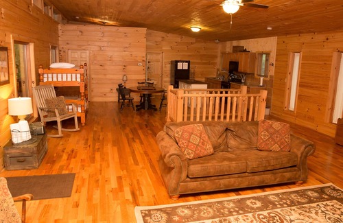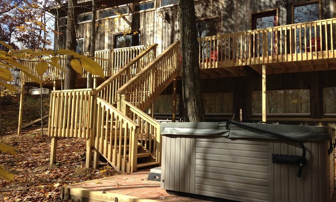 We are confident that once you arrive it will be hard to leave. Our cottage sits on 5 wooded acres very private offering a 6 person hot tub, full kitchen, one bedroom with queen size bed , one queen size sleeper sofa and twin bunks in the great room , stone woodburning fireplace, outdoor firepit, front porch, 52ft balcony loverlooking the tall oaks and wildlife, and gas grill.