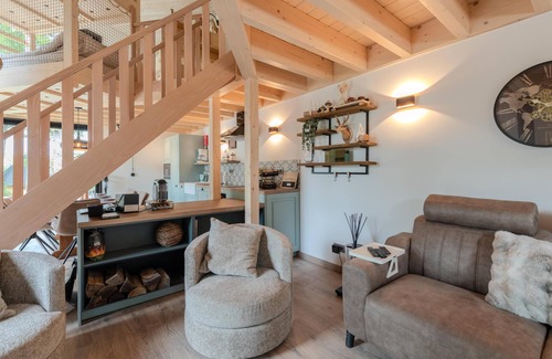 Cosy holiday home with wood-burning stove, fully equipped kitchen, 2 bedrooms with double beds and private bathroom and on the mezzanine a sleeping area with 2 bunk beds. Bathroom and separate toilet available. Outside you enjoy a spacious garden with terrace, cosy BBQ area, wellness with infrared cabin, outdoor shower, toilet and wood-fired hot water bath. Bicycle storage, parking with charging station and access to a shared park, petanque court and playground. Pure family enjoyment!