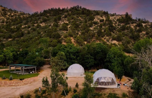 Experience a one-of-a-kind glamping adventure in our unique dome retreat, nestled in the serene landscapes of Glendale, Utah. Two brand new domes that sleep 8! Located just 20 minutes from Zion National Park and less than an hour's drive to Bryce Canyon this property is your perfect base for nature enthusiasts and adventure seekers. Offering both seclusion and convenience, each dome sleeps 4 and offers a kitchenette and full bathroom! The Virgin River runs right through the property! Stargaze from the hot tub or cold plunge in the river! Don't wait, book now!