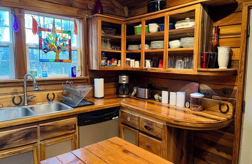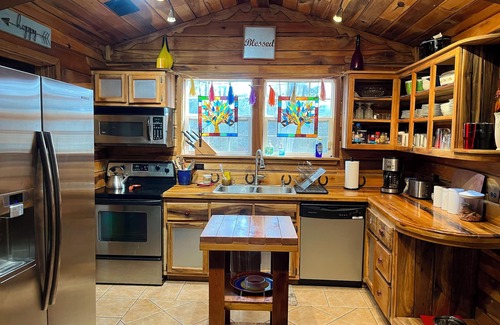 Our accommodations include a one bedroom/1 bunk room cabin complete with full kitchen, laundry room, 2 baths with showers. The bedroom downstairs has a queen bed. There is also a queen sleeper sofa in the living room. Upstairs can accommodate 6 people: 2 bunkbeds and a trundle bed. There is a full bath both downstairs and upstairs. The half bath is in the SHARED (with camper guests) laundry room. Wifi and TV are included. The kitchen has a full sized refrigerator, stove, microwave, and dishwasher. We leave coffee and tea and eggs for you to enjoy.