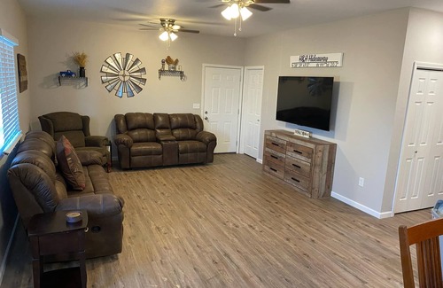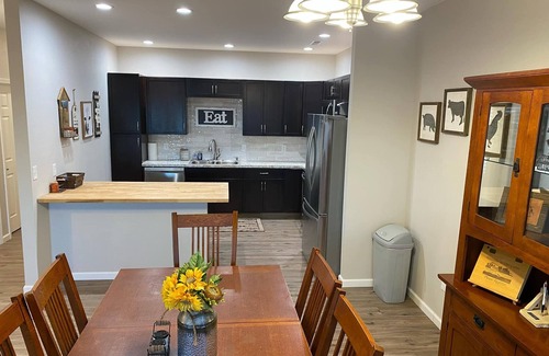 1,200 square feet living space, located within a farm shed. Living area has an open floor plan with large living room, dining and kitchen area, perfect for gathering. Sleeps 6 comfortably. 2 bedrooms, One with King size bed, tv and large closet. The second bedroom has a queen bed and twin over twin bunk beds. One and half bathrooms. The house also a washer and dryer.