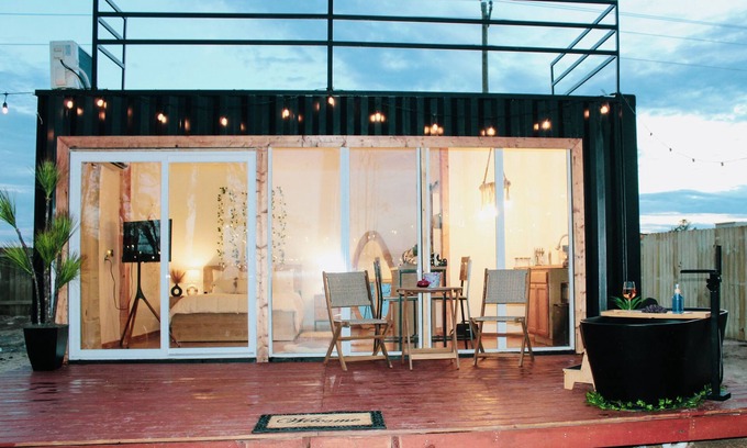 Container built cabin type inside with a boho style where you can rest and relax you have a tub where you can take a hot water bath and it will be a stress relief, we also have an outdoor shower where you can cool off,we have mini golf, billiard table, swings, campfire in short to spend an unforgettable time.