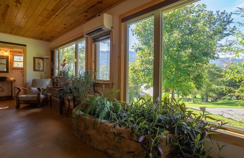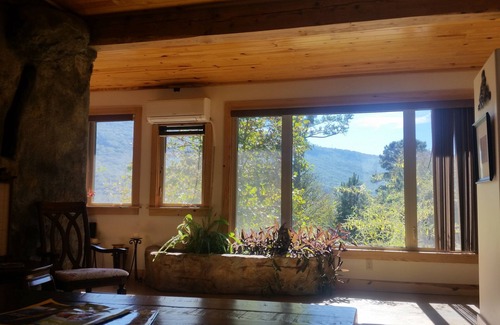 This hand-carved, artful cottage has a charming interior and large windows framing scenic views of Lookout Mountain. Inside, you'll find wood ceilings, a huge stone center wall, a full kitchen, and a spa-inspired bathroom with a stone sink and a large tile and stone shower. A queen size bed in the bedroom and a queen size sleeper sofa in the living room provide ample sleeping space for up to four guests. Outside there is a hot tub, fire pit and covered outdoor seating where you can hang out and enjoy the scenery.