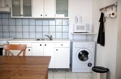 The kitchen is fully equipped with all appliances to prepare your daily meals. A washer is available for your convenience. There is a dining table for six. The kitchen area has lovely sea views. There is a bathroom with shower.