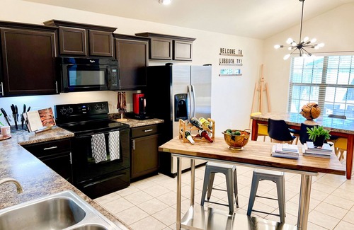 Enjoy a fun and unique experience at this home located in South Lubbock. Quick access to a wide variety of restaurants and entertainment. Spacious living room and open kitchen with a patio. Great home for entertaining with large TV’s located in the living room, kitchen and on the patio. Perfect for a group get-together or just a weekend getaway.