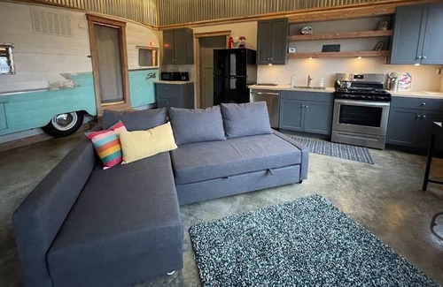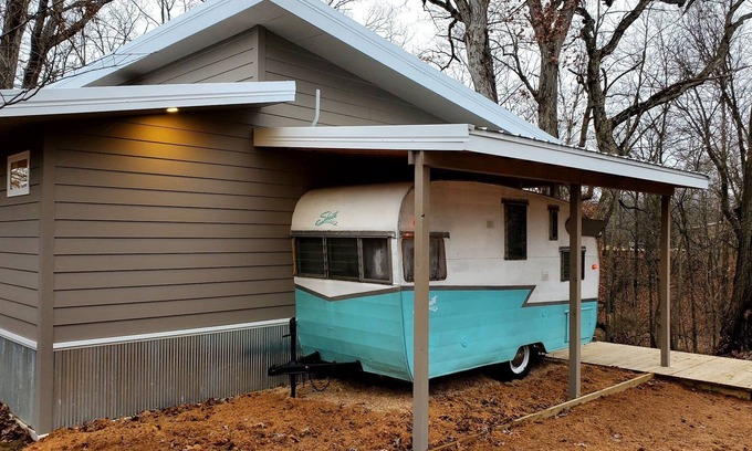 Private, with big windows and modern conveniences. We'll equipped kitchen, large shower room, king sized bed in adapted 1963 Shasta camper. Serenen nature get away. Sauna, grill, outdoor space. Easy stay
