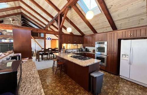 Welcome to this charming vacation rental in Craigville Village, offering a delightful retreat for up to 6 guests. Situated less than a mile from the beach, this quaint location is reminiscent of a bygone era, with its tabernacle meeting house, inn, and small cottages resembling gingerbread houses. The presence of a playground adds to the appeal, making it perfect for families. The house itself is a unique post and beam creation by the renowned architect David Howard, known for his exceptional timber homes. Upon entering, guests are greeted by an impressive south-facing solarium, exuding brightness and openness. The solarium features a relaxing sitting area, setting the tone for a tranquil stay. The accommodation comprises 2 bedrooms and a den/bedroom surrounding the open living room. Both bedrooms are equipped with queen beds and trundles, with the second bedroom boasting an en-suite with a shower. The living room offers a flat screen TV and comfortable seating, while a second full bathroom includes a large shower and jacuzzi tub. The first floor is completed by a den with a queen futon and a washer and dryer for added convenience. Ascending the open concept staircase to the second level, guests will find a living room area with views of the wooded lot. The opposite side of the room houses a large dining room table and a spacious, fully-equipped kitchen. Off the kitchen, an amazing rooftop deck awaits, featuring a gas grill, outdoor dining with an umbrella, and a seating area. This idyllic space is perfect for enjoying morning coffee or evening cocktails while feeling immersed in nature. The vacation rental's proximity to beaches, restaurants, shopping, and more ensures that guests can easily explore the area's attractions. With its unique architecture, thoughtful amenities, and convenient location, this house offers an unforgettable experience for those seeking a peaceful getaway.