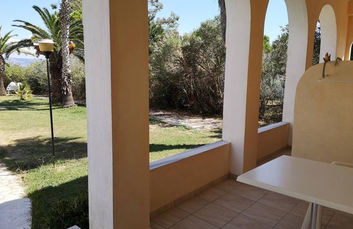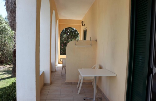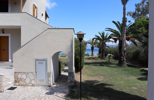 Beautifully situated directly by the sea, this small complex has its own access to the water and a unique view of the Ionian Sea as far as the mainland opposite. The functionally furnished Studio Irini 8 is located on the raised ground floor of the centre building, with its own rear entrance. The open-plan bedroom is adjoined by a small kitchenette and bathroom. Direct access to the covered terrace and garden via 5 steps.