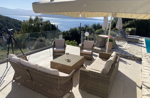 There are several outside seating areas - a large table on the covered terrace with two smaller tables positioned to maximise the panoramic views. There are six rattan sun beds and a recently extended lounge area with settee, large parasol, armchairs and low table for an evening sundowner admiring the stunning view across to Albania, the beach below and the busy Corfu Straits always active with yachts, ferries and fishing boats.