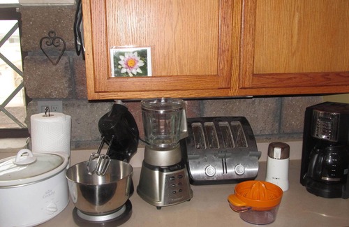 Family kitchen, mixer, micro and toaster all here. Theres a clothes washer but our dry desert air make it easy and fast to line dry so thats mostly what we do. Designer Sheets bedding and luxury towels are provided as well as paper products (kleenex/ toilet tissue and paper towels within reason)(also dish soap)..