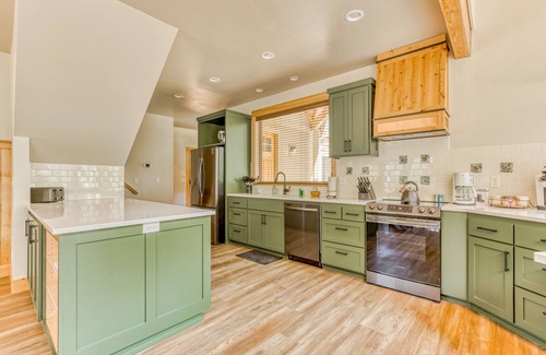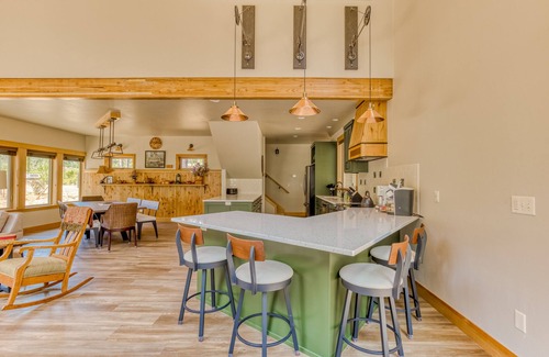 Inside the main house, a dramatic front wall of windows provides floor-to-ceiling views overlooking the McKenzie River. Comfortable lounge furniture makes the open-concept living room, dining room, and kitchen an inviting spot to enjoy the company of friends and family. Tie fly-fishing flies from the comfort of the sofa or find yourself watching a movie on cable. A gas-powered fireplace keeps the space intimate and down to earth. Complimentary in-home WiFi makes it easy to stay in touch on social media, browse the web, or catch up on some remote work. Celebrate meals as a group while the phenomenal views feed your senses around the charming wood dining table. Meal prep is made easier with help from a well-stocked kitchen and there's additional seating at the breakfast bar. Once the plates are cleared, leave the cleanup to the dishwasher while you dive into a good book by the fire or get lost in a puzzle or game.