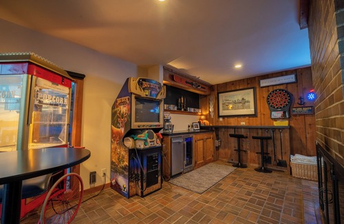 Inside, the delights continue with a plethora of indoor amenities. Challenge your friends and family to a friendly game of pool or unwind in the steam sauna for the ultimate relaxation after a day of river adventures. The bar room comes equipped with an ice machine, a Jimmy Buffet Margaritaville concoction maker, a popcorn machine, dartboard, and the Buck Hunter arcade game for endless entertainment. The living room's sunk-in conversation pit is the perfect spot to gather around with friends and family to unwind with a movie and some popcorn while enjoying the great view of the Illinois River Valley.