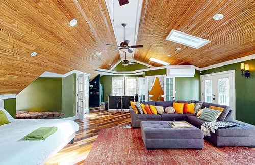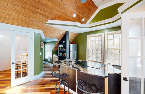 A unique riverside retreat awaits you in Rock Hill. Above the garage, this full studio apartment is full of light and bohemian decorations. There is a well-equipped kitchen, making cooking a breeze, and a whimsical bathroom complete with a clawfoot tub and walk-in shower. The living space is perfect for family movie nights or simple days in. A shared washer/dryer, a collection of board games, and internet access round out the interior amenities.