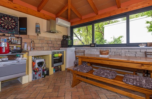 It is located on the eastern shore of Istria, near the town of Labin, only 4 kilometers from the nearest beach. The house is set among the trees in a fenced property of 3000 sqm, providing complete privacy.