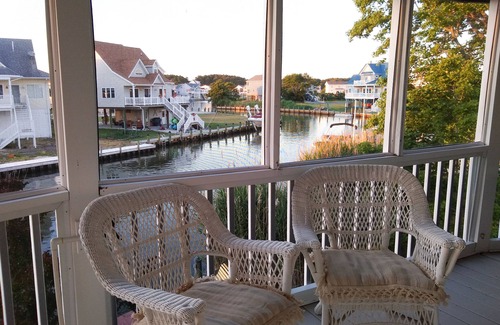 This newly renovated unique round home features a spacious open floor plan with spectacular water views from every room. The large kitchen is fully equipped with everything you’ll need, and the dining table seats 8 people. The large comfortable living room (which includes a sleeper sofa) features a 65 inch flat screen Roku TV and blu ray player. The master bedroom has a 36 inch Roku TV and the double bedroom includes 32 inch Roku TV. The 4th bedroom hasa 32 inch Roku TV. Free WiFi is provided to connect your digital devices and for streaming (no cable TV). Both bathrooms feature large luxury showers with multiple shower heads. The 3 main bedrooms have French doors opening onto the porch and ceiling fans. The spacious screened porch offers plenty of seating and a dining table so it’s perfect for enjoying the cool breezes off of the bay and the beautiful view of the canal. In addition, this vacation home offers extras including board games and puzzles, 2 crab traps, 2 kayaks and a deep freezer for fishermen’s catch, a charcoal grill and covered outdoor space for your enjoyment. On the ground level you’ll find Adirondack and lounge chairs and a hammock for relaxing in the shade or on the waterside deck on the canal. Just imagine relaxing while the kids fish and catch crabs right in your own backyard!