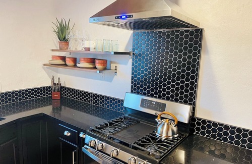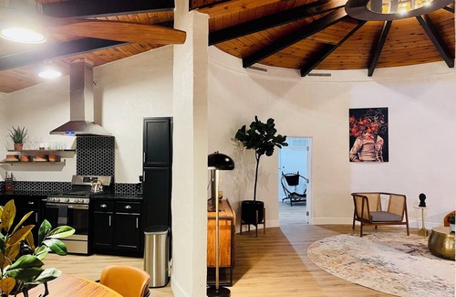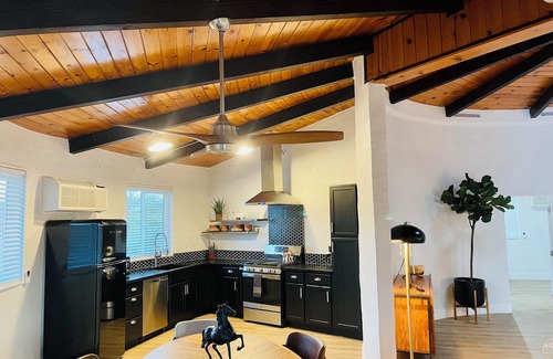 Make some memories at this unique and family-friendly place. Thoughtfully restored while bringing out the beauty of the circular walls and ceilings. Just 20min from Palm Springs and 50min to Joshua Tree. Remodeled kitchen, bathrooms. Outdoor fire pit, above ground pool in summer months and BBQ for family entertainment.