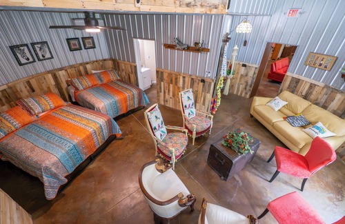 Each guest grain bin is designed with open concept so no interior walls other than around the full bathroom/showers. There is a full bathroom on each level of the guest grain bins which are attached to the large red barn known as "the Roost".