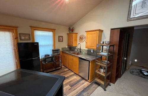 Upon arrival there's a dedicated parking space. The double French doors have a digital lock eliminating the worry of carrying a key. Once inside there is a great room with a kitchenette, island with seating, a dining table and chairs and a living room. There is a bedroom with a king size bed, desk, chair, nightstands with lamps an armoire plus double closets with drawers. Large stone fireplace, skylights and numerous windows for a cozy feel. In the summers enjoy the sound of the creek that runs alongside of the apartment.
