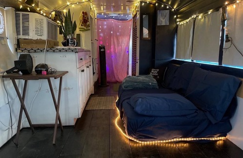 This cute tiny home has a very warm, loving, and inviting feel. We curated our air conditioned skoolie to attract couples, nature lovers, and adventurers looking for a homey retreat in the desert.