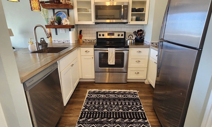 Locally owned and operated. Newly renovated with upcycled local accents and eco friendly products. All new premium wood cabinets combine with one of a kind solid cement coulter tops, stainless steel appliances, and mango wood shelving in the kitchen. A premium sofa sleeper is in the living room with a 50" high definition TV and electric piano. A large, comfortable king size bed, and 40" smart TV are in the bedroom. An extra twin size day bed in the sitting area and wireless high speed internet, and basic cable are included. Central AC keeps the unit cool. Bathroom has a full bath and double sinks.