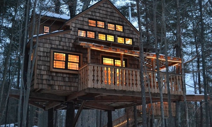Tucked away in the woods near Mount Sunapee and Lake Sunapee, this two-bedroom, one-bathroom escape offers romance, privacy, and charm—an unforgettable experience. Knock this one off your bucket list: SLEEP IN A TREEHOUSE!