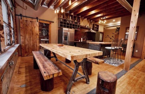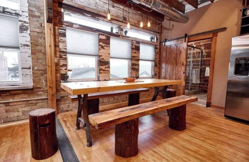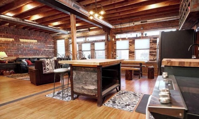 This upper home/loft is 1780 sq ft spacious. Built in a 1922 brick office building it provides a downtown location. The home boasts vintage charm, warmth of wood, high ceilings, unique designs and décor. A great room/kitchen area is perfect for enjoying your time at our place. It also provides comfortable seating and a large farm house style table for games and fun. 3 bedrooms and 2 full bath with king beds and a bunk room.