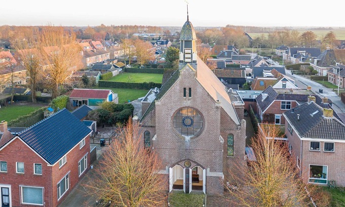 You can spend the night together with your group in a unique way 'In the church'. It is reformed into an attractive, quiet, very luxurious villa in 1913. Enjoy the original details such as the pulpit and the thousands of stained-glass windows with your family or friends. Outside in the garden you can sit on the terrace at the long table. Parking is free in front of the church or at the parking bays. Unwind in the sauna for soothing mind, body, and soul. Elfstedenstad Dokkum Centre is 8 km away where you can shop the essentials. The general supplies required for the stay are close-by. The church consists of a large open space with a sitting area with a gas fireplace, cozy bar, dining area and an open well-equipped kitchen. If you prefer not to cook yourself, you can book a private chef through the owner. Upstairs is a honeymoon suite with internal balcony at the top of the church where the old organ was. Electric car charging at 2 public charging points in the village within walking distance.