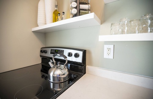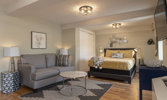 Relax in a chic, industrial suite with a queen bed, Smart TV, and fully equipped kitchen (fridge, stove, oven, microwave, kettle, cookware, spices, and complimentary coffee). The bathroom has a modern shower, and board games and books are provided for cozy nights in.