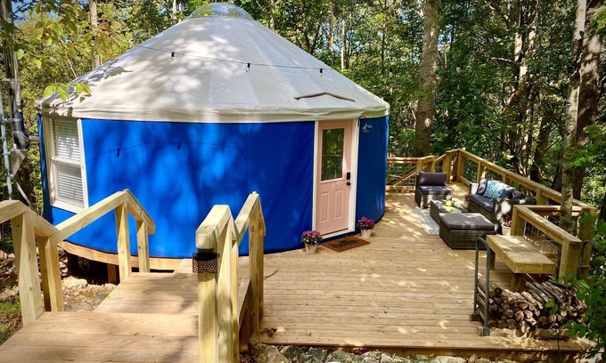 Escape to the tranquil setting of Floyd County and indulge in the comfort of this charming 24' yurt nestled on 23 sprawling acres. Rejuvenate with a serene hike to a beautiful creek. The yurt has all the modern conveniences including: fully equipped kitchen, bathroom with shower, washer/dryer, Smart TV with Netflix, WIFI, gas free standing stove, and fire pit with complimentary firewood. Dogs (2 max) are welcome for $10/pet/night. Embrace nature's splendor and make lasting memories in this idyllic haven.