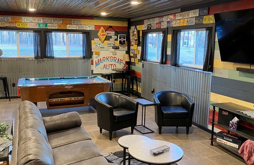 Located in Aniwa, Unique Renovated Building- Sleeps 4. One-of-a kind studio space with easy access off main highway. Ample parking for trailers. Open concept living area includes a large tv with surround sound, wireless wifi, and a fully equipped kitchen. Rest your head on the new queen murphy bed with high quality mattress or the thick fluffy queen futon. Enjoy a game of pool or relax in the wooded outdoor setting. Perfect for a relaxing getaway. Offers the ideal blend of cozy vibes and fun amenities. Close to hiking, biking, utv/atv, and snowmobile trails