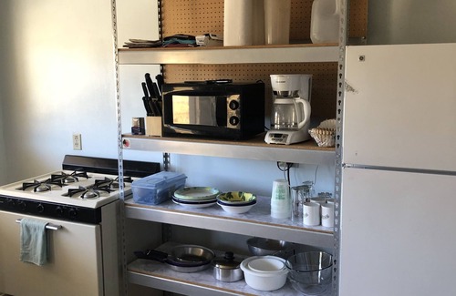 Propane wall heater, refrigerator, stove/oven, microwave, basic kitchen supplies.
