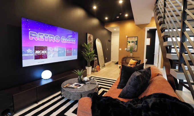 The fully equipped kitchen is perfect for preparing meals, while the roomy living area offers a comfortable space to unwind together, watching the 84" Big Screen Smart TV with a retro gaming system with 2000+ games.