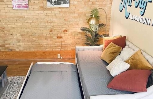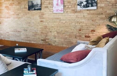 Our building has huge ceilings and some beautiful original brick walls. There are 2 large bedrooms down the hallway with King Beds. The deck on the back is about 400 square feet and a great spot for hanging out with city lights or people watching during a concert or sports event at the brand new Fiserv Forum. The location could not be better for exploring the many different aspects of Milwaukee, from museums to fine dining to night life. It is a great neighborhood to walk in. If you are headed to The Brewers Stadium or the Summerfest grounds, there are three bars on the street that run shuttles there and back if you merely buy a drink, even a soft drink will do. The staff at the spice shop downstairs is happy to give you advice on what to do, and if you love to cook, you will be in heaven there!