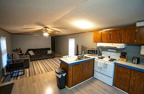 This Unit is supplied with a cozy living room, a stocked kitchen, as well as 2 bedrooms with 2 queen beds and 1 pull out sofa. Also has a bathroom with a walk in shower! All furnishings are brand new in this unit (comfortable bedding). Our property has adequate parking for all guests and trailers for Atv’s.