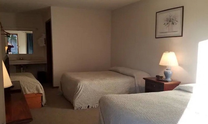 The private room has two full-size beds, one single bed, private bath, private entrance, a desk, and a TV. It is part of a 12-room lodge on the Ohio River Scenic Byway within a five-minute drive to the Golconda Marina, the Golconda Food Mart, restaurants, bars, and stores. Many attractions in the Shawnee National Forest and Southern Illinois are within a 30-minute drive.
