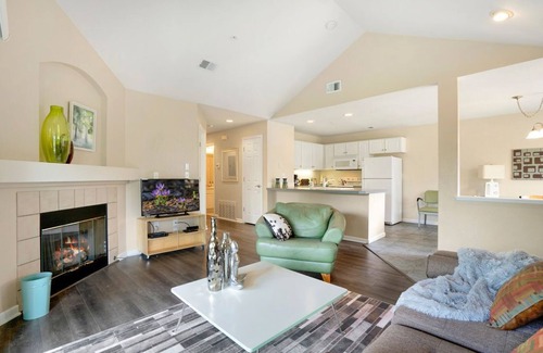 A living room, a fireplace, air conditioning, and a desk are featured at this 2-bedroom, 2-bathroom rental. Prepare a home-cooked meal in the kitchen, complete with an oven, a stovetop, and a refrigerator, as well as a coffee maker, an electric kettle, and a microwave.