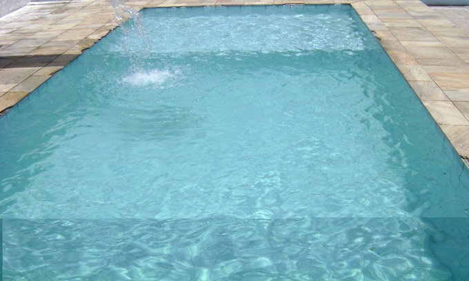 , swimming pool with waterfall and lighting, barbecue, air-conditioned room