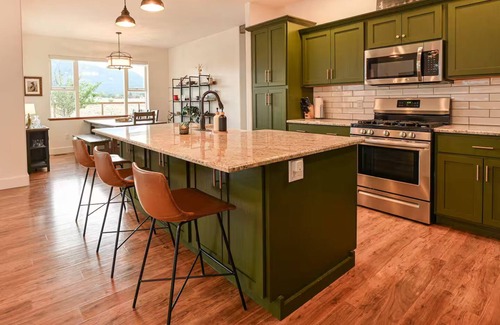 The open living room offers plenty of seating for a large group and a big-screen TV, with sliding glass doors that lead to the back patio. Outside, relax around the firepit in Adirondack chairs, enjoy meals at the outdoor dining table, lounge in the hammock, let the kids explore the playhouse, or fire up the grill—all while taking in the unobstructed mountain views. The front porch is a perfect spot to sip your morning coffee while watching the sunrise over the peaks.