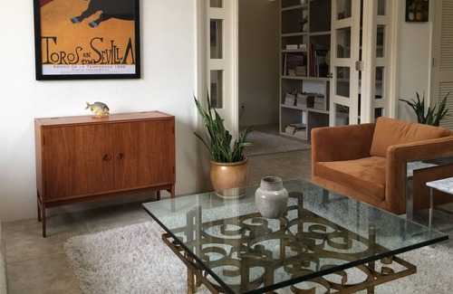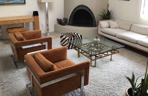Completely renovated and upgraded desert town home features vintage mid century designer furnishings throughout. Pieces by milo baughman, artifort, pierre paulin, roger capron, sonneman, george kovacs, eames, harvey probber decorate this property. Colorful splashes of modern art accent the furnishings. Vintage audio (bang & olusen / ohm) and visual (lg) components provide viewing and listening pleasure. Large master bedroom furnished with king size bed opens to mountain views from patio. Second bedroom is furnished with full size bed and has mirrored wall and carpeting. Master bath is large and features an open dual shower and Toto washlet. Back patio looks onto the lush desert vegetation and takes an unobstructed 180 degree view of the Catalina Mountains. There is a gas bbq for grilling. Outdoor dining and lounging arrangements are in place for enjoying the desert lifestyle. Private green patio space and garage parking are at the front of the property. Two brand new bicycles are available for use in the garage. Swimming pool is located a few steps from the front door. Five minute walk to tucson's most elegant shopping and dining experience at La Encantada.