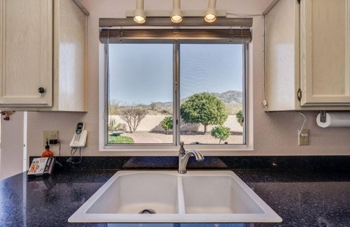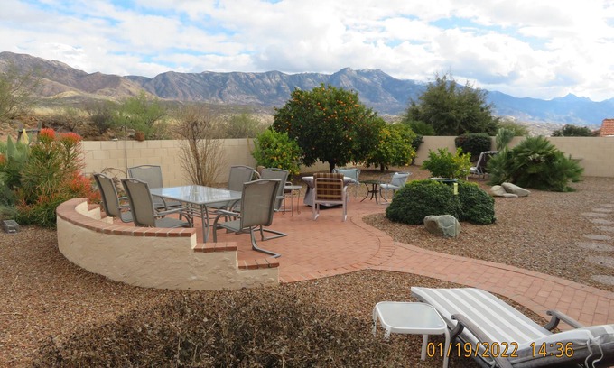 Wonderful 55+ Community surrounded by mountains NE of Tucson. Our HOA requires a 14 night minimum stay. Get ready to enjoy the SaddleBrooke life with your East ( Mountain) facing back yard. And as a bonus, the West facing front patio has views of the Tortillas in the distance. The home is set up inside with an East facing Master that has a King size bed with a Beautyrest mattress/boxspring, two nightstands, 42" TV, dresser, sliding door access to outside, en suite with walk in shower, walk in closet with some built in drawers/shelves. The kitchen with granite counter tops has all you will need to cook, bake and entertain. The window looks out at the open patio and the mountains. The rear covered patio has a gas Weber grill. The Great Room has a 65" TV with ROKU and You-Tube TV. Has seating for 8-10 with a couch, love seat, two chairs, recliner and three ottomans. The second bedroom has a king size bed, two nightstands, desk area and wardrobe.