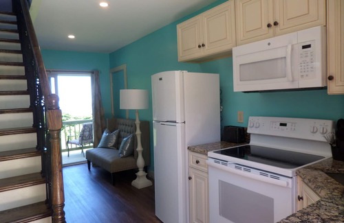 Upstairs has a large bedroom with one king bed, climate control machine, white noise machine, magnificent ocean-views, amazing sunrises, television, bathroom walk in tiled shower and lots of closet space, shelving and climate control machine with heat and air conditioning.