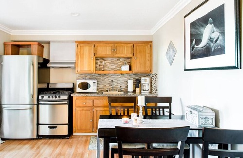 Spacious 1st floor apartment home for your most welcomed and quality stay. We are 3 blocks to the famous Main Beach and tower, and 1 block away from our downtown Village. From your bed, you hear the waves crashing, and seals barking if they are in the cove. We just completed the complete remodel in 2016.